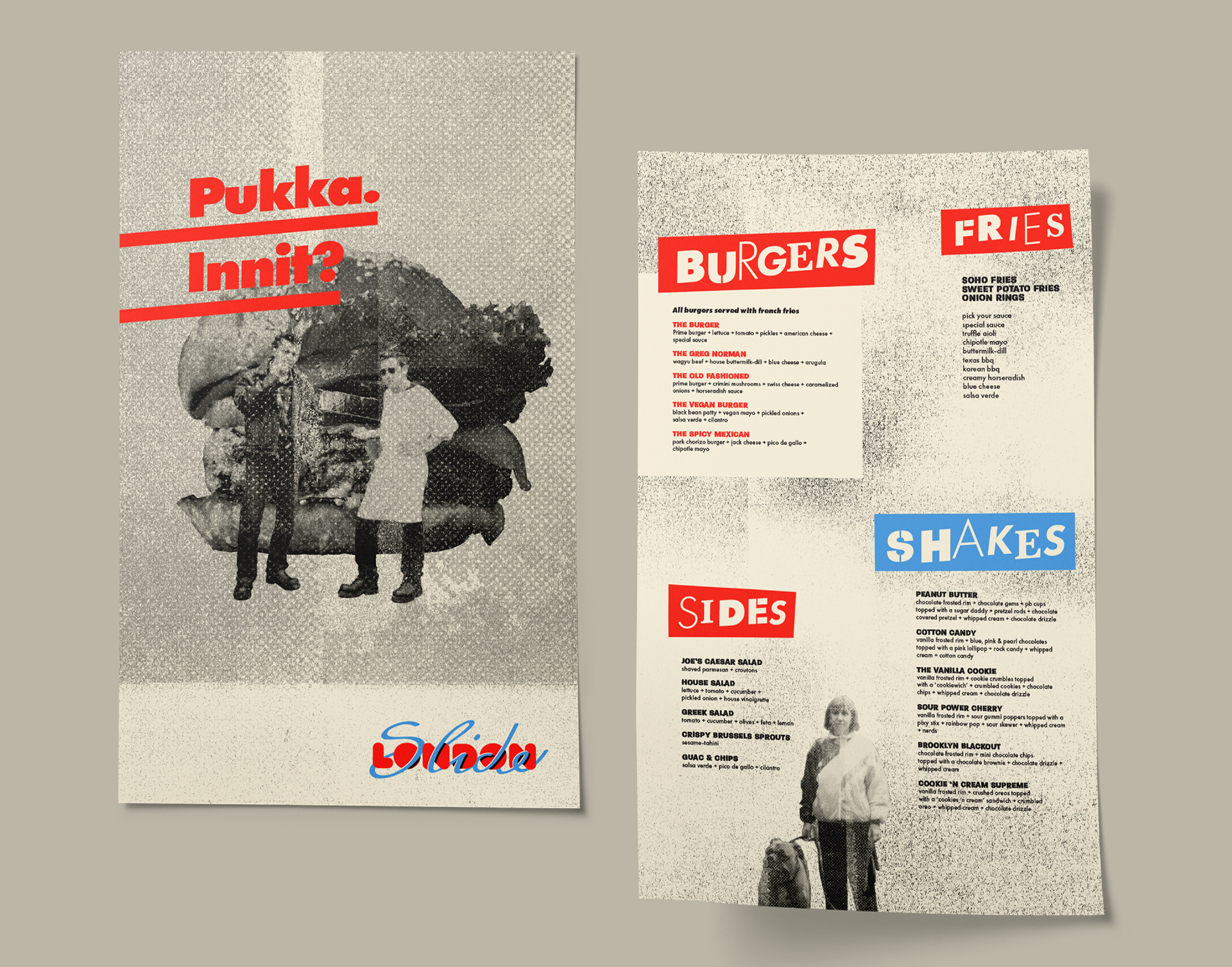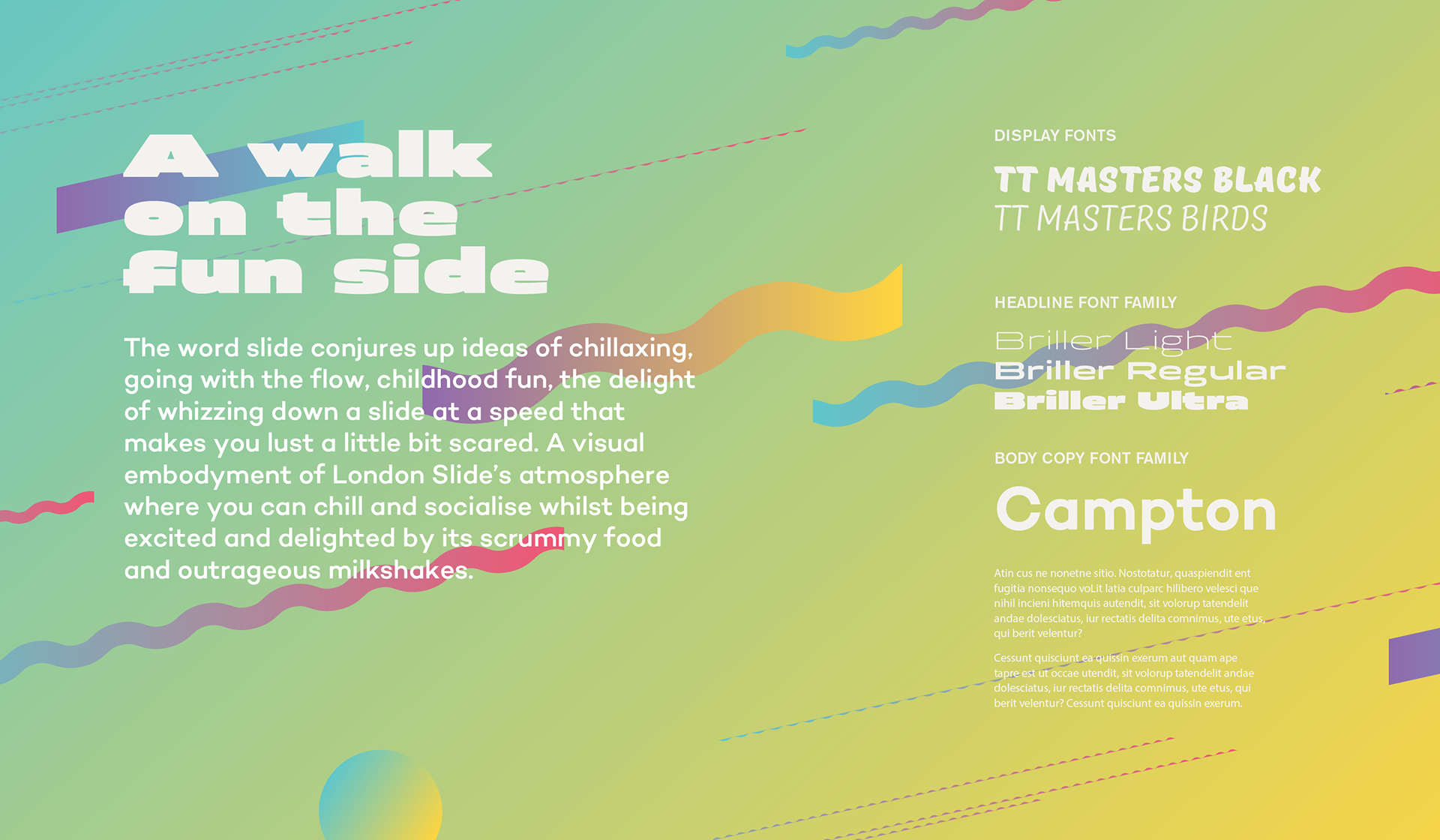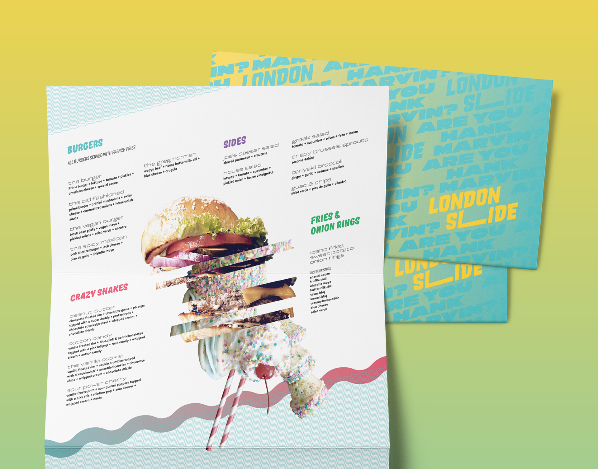 Two brand concepts developed for London Slide, a funky, London‑Project‑backed eatery. Commissioned by Jansen Harris. Completed in 2017.