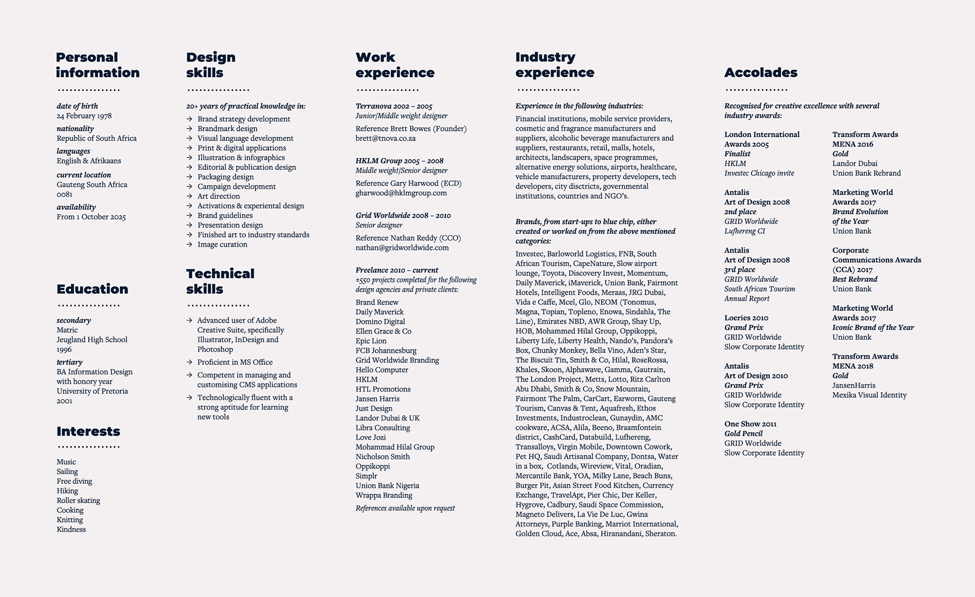 I am Marette, a designer of graphics with 20+ years of experience, skilled in building brands from the ground up by turning conceptual thinking into strong, memorable visual expressions. I specialise in concept development, brandmark design, visual language development, creative direction across both print and digital applications and brand system guidelines. I’ve worked with everyone from agile startups to established global brands, delivering creative work that’s both strategic and visually impactful.